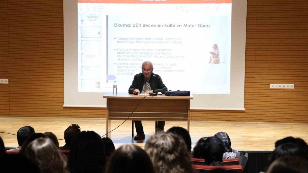 Sağlık Bilimleri Fakültesi Konferans Salonu’nda programa; Düzce Üniversitesi Hakime Erciyas Yabancı Diller Yüksekokul Müdürü Dr. Öğr. Üyesi Osman Dülger, akademisyenler ve öğrenciler katılım sağlarken, Hacettepe Üniversitesi Yabancı Diller Eğitimi Bölümü Emekli Öğretim Üyesi Prof. Dr. Cengiz Tosun konuşmacı olarak etkinlikte yer aldı.