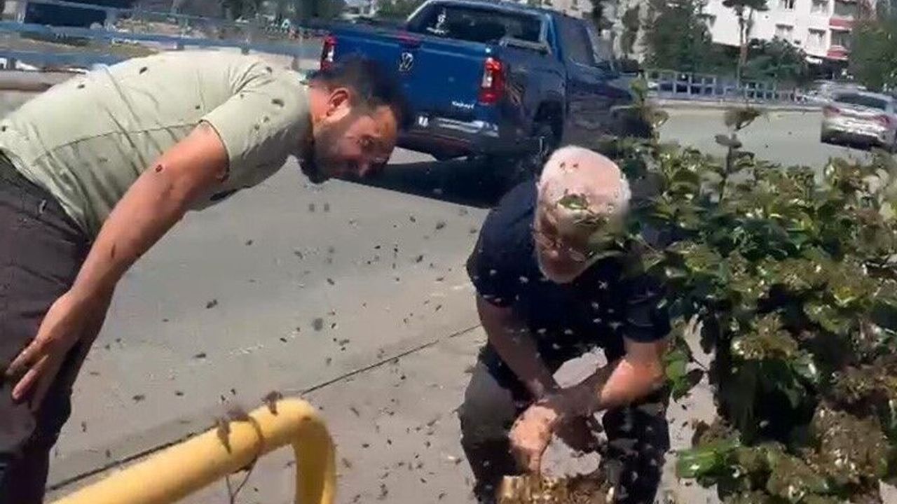 Rize’de oğul bırakan kovanın arıları ilçe merkezindeki çiçek saksısını sarınca ortaya görsel şölen çıktı.