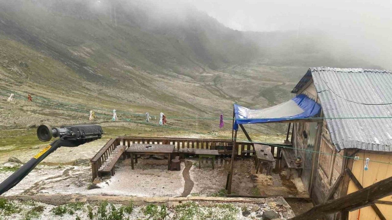 Doğu Karadeniz Yaylaları’nda artık yaz bitip sonbahar etkisini göstermeye başladı. Rize’nin Çamlıhemşin ilçesine bağlı 2040 rakımdaki Hazindak Yaylası’nda yaşayan yaylacılar sabaha dolu yağışı ile uyandı. Yaylalarının beyaza büründüğünü gören yaylacılar dolu yağışından olumsuz etkilenmemek için bir süre evlerinden çıkamadı. O anlar ise bir yaylacının cep telefonu kamerasına yansıdı.
