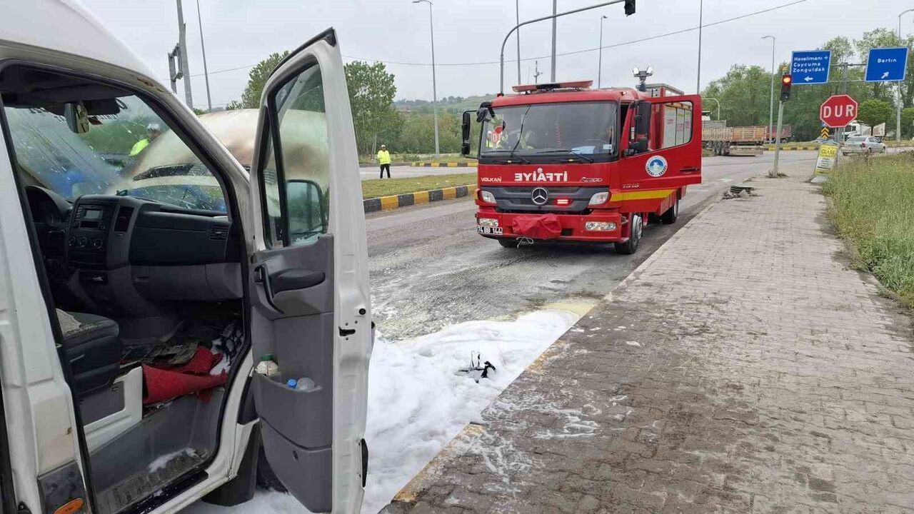 Edinilen bilgiye göre, Kozcağız Beldisi’nden il merkezi istikametine seyir eden ve sürücüsünün ismi öğrenilemeyen 74 DD 507 plakalı minibüs Terminal Kavşağı’nda alev aldı. Büyük panik yaşayan sürücü arkasında bulanan bir araca da çarptı. Tesadüfen bölgeden geçen trafik ekibi ise önce haber merkezine telsiz anonsu ile bilgi vererek, itfaiye istedi. Ardından ise sürücüyü araçtan dışarı çıkarttı. Ekiplerin zamanında müdahalesi ile yangın büyümeden söndürülürken, aracın yakıt deposunda sızıntı olduğu ve oto saniyeye götürüldüğü öğrenildi.