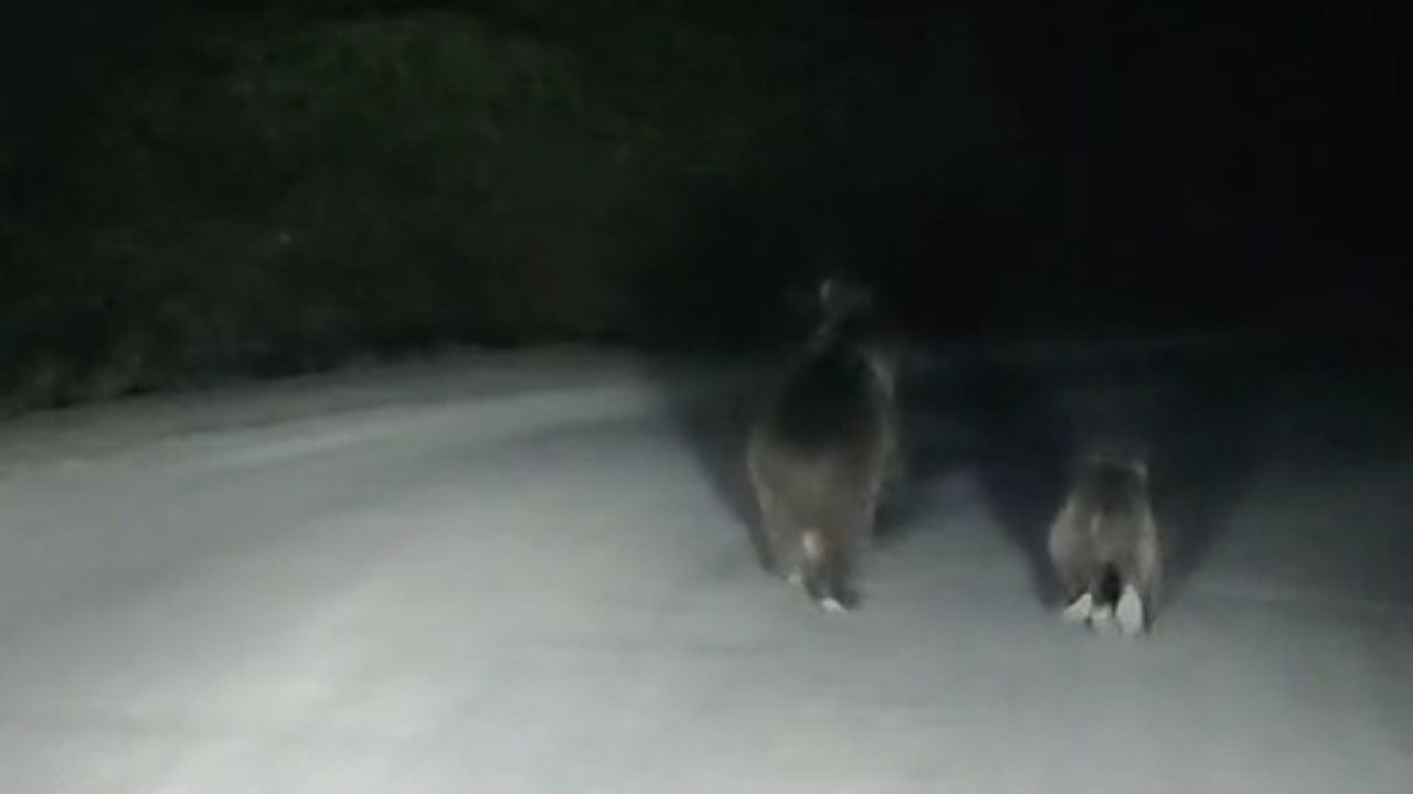 Bartın’ın Ulus ilçesi Ulukaya Kadıköyü grup yolu üzerinde otomobil ile seyir halinde bulunan bir vatandaş, yolda bulunan bir ayı ve yavrusunu gördü. Ayı ve yavrusu otomobilin ışıklarını görünce hızla kaçmaya başladı. Ayıları gören vatandaş ise cep telefonu kamerası ile o anları görüntüledi. Ayılar bir süre sonra ormana girerek gözden kayboldu.