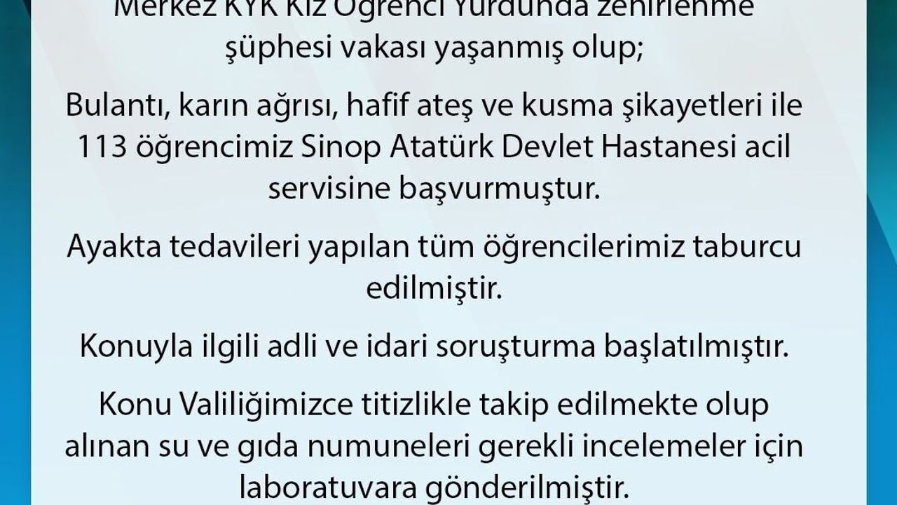 Sinop’ta KYK kız öğrenci yurdunda kalan 113 öğrenci, bulantı ve kusma şikayetiyle hastaneye başvurdu. Zehirlenme şüphesiyle alınan su ve gıda numuneleri laboratuvara gönderildi.