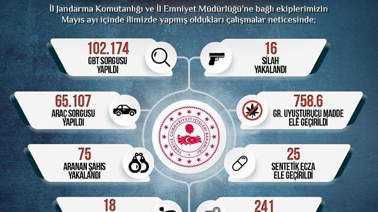 Sinop’ta Mayıs ayında 102 bin 174 kişinin GBT sorgusu yapıldı, aranan 75 şahıs yakalandı, uyuşturucu ve silahlar ele geçirildi.