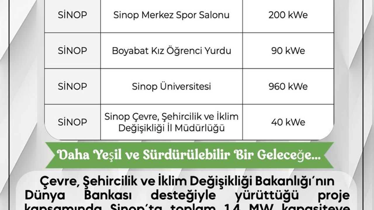 Uygulama kapsamında Sinop Gençlik Merkezi, Sinop Merkez Spor Salonu, Boyabat Kız Öğrenci Yurdu, Sinop Üniversitesi ve Sinop Çevre, Şehircilik ve İklim Değişikliği İl Müdürlüğü binalarına yerleştirilen güneş enerjisi santralleri ile elektrik üretimi yapılacak.