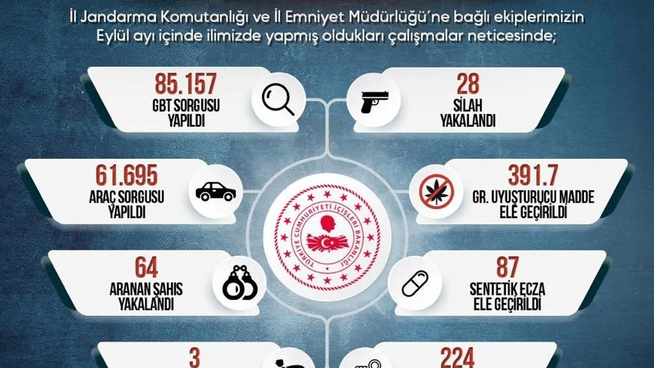 Eylül ayı boyunca yapılan uygulamalarda ayrıca 64 aranan şahıs, 3 hırsızlık şüphelisi yakalanırken, 28 ruhsatsız silaha el konuldu.