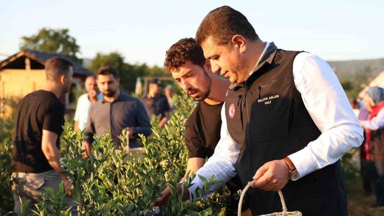 Düzce’de üniversiteli girişimcinin yetiştirdiği yaban mersinlerinin ilk hasadını Vali Selçuk Aslan elleriyle yaptı.