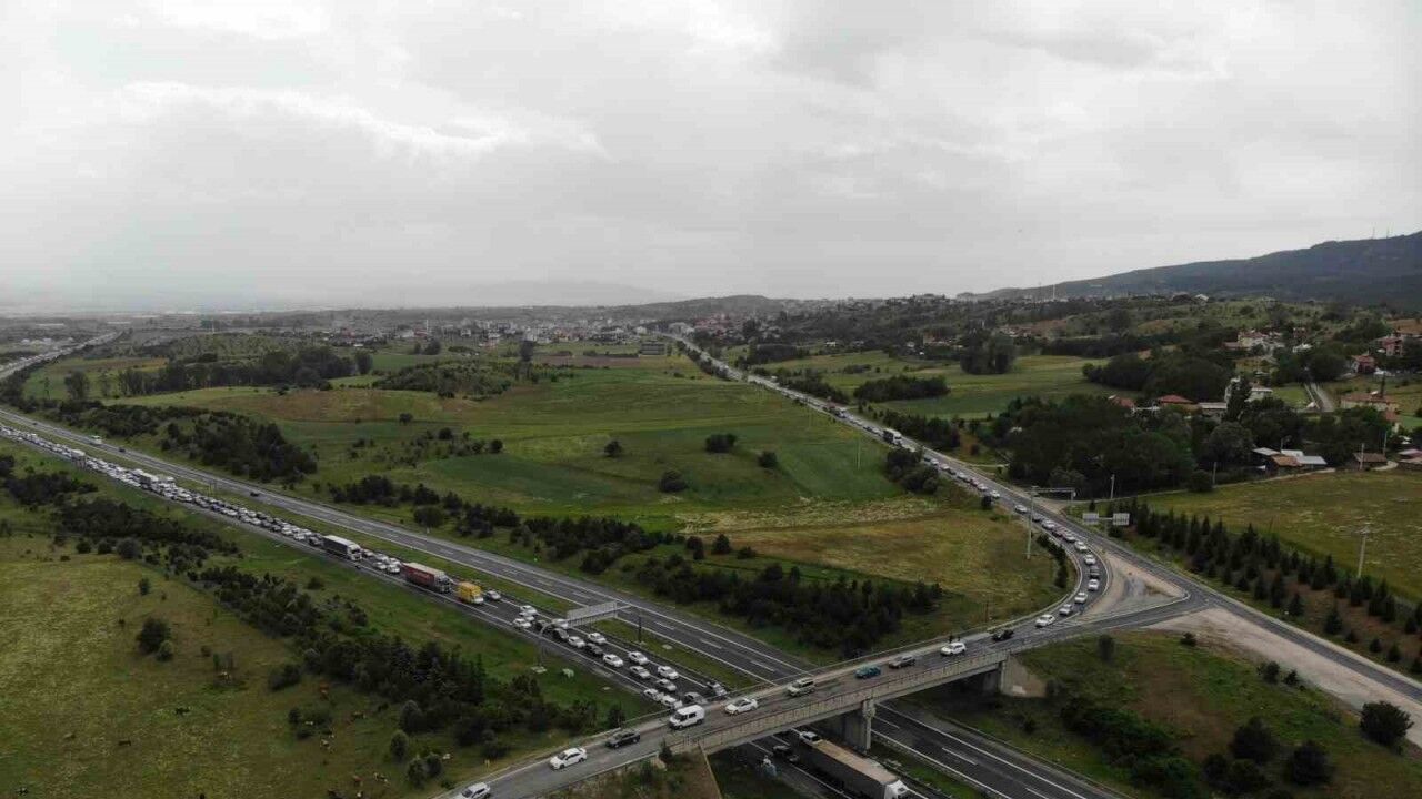Kurban Bayramı tatili dolayısıyla memleketlerine ya da tatil bölgelerine gitmek isteyen tatilciler, Gerede-Karadeniz Bağlantı Yolu’nda uzun araç kuyrukları oluşturdu. Oluşan yoğunluk havadan da görüntülendi.