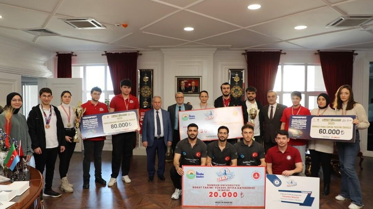 Başkanlık makamında gerçekleşen ziyarette, TEKNOFEST yarışmasında desteklenen yüksek irtifa kategorisinde ikinci olan ‘Samsun Roket Takımı’na 20 bin TL, elektrikli araçlar kategorisinde birinci olan Samsun Üniversitesi (SAMÜ-ELAR) takımına 30 bin TL’lik çeki Başkan Demirtaş verdi.