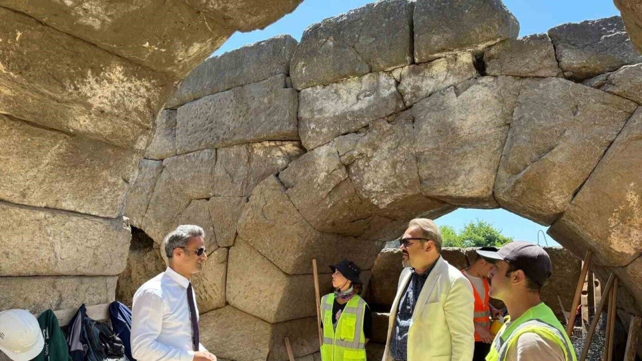 İncelemeler sırasında Prof. Dr. Şahin Yıldırım, Kaymakam Kaya’ya kazı sürecine ilişkin teknik bilgiler vererek, antik tiyatronun tarihi önemi ve restorasyon süreci hakkında ayrıntılı sunumda bulundu.