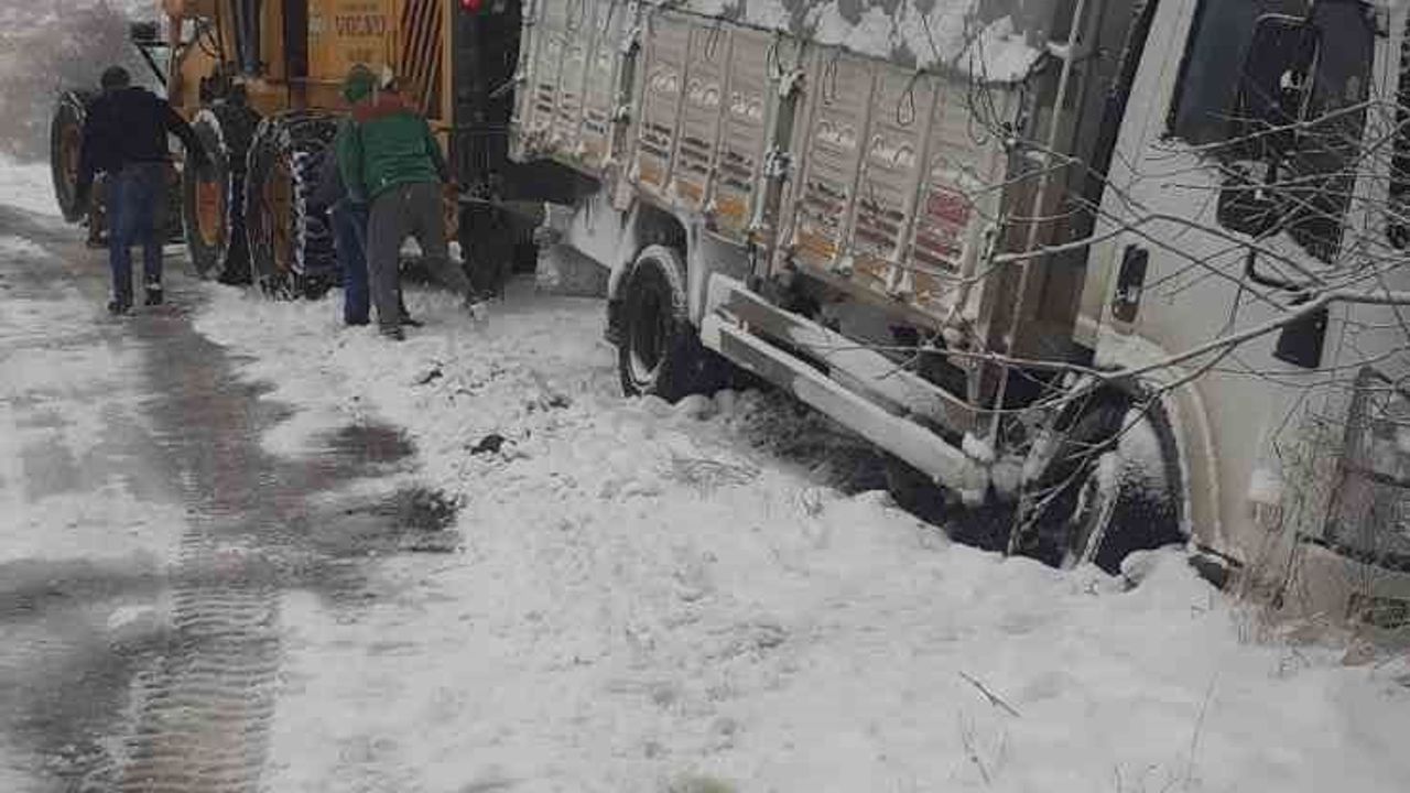 Tokat’ın Reşadiye ilçesinin yüksek kesimlerinde kar yağışı etkisini artırırken, bir kamyon yoldan çıkarak yan yattı.