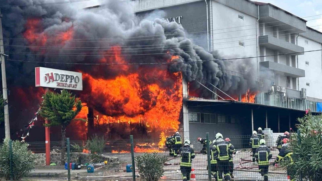 Trabzon’un Akçaabat ilçesinin Darıca mahallesinde ’Deppo’ isimli alışveriş merkezinde yangın söndürme çalışmaları sırasında yangın yeniden alevlendi, alevler tüm binayı sardı.