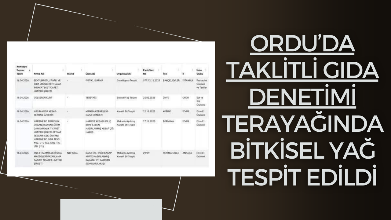 Tarım ve Orman Bakanlığı tarafından güncellenen “Taklit veya Tağşiş Yapılan Gıdalar” listesinde yer alan denetim sonuçlarında, Ordu’nun Ünye ilçesinde faaliyet gösteren bir işletmeye ait tereyağında uygunsuzluk tespit edildi.
