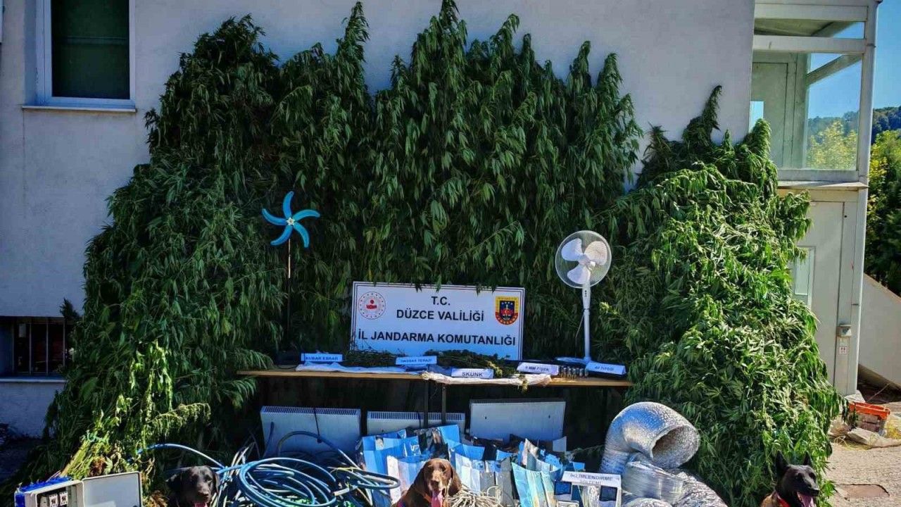 Açıklamada, "Cumhuriyet Başsavcılığımız koordinesinde Gümüşova İlçe Jandarma Komutanlığı, Narkotik Suçlarla Mücadele Şube Müdürlüğü ve Kaçakçılık ve Organize Suçlarla Mücadele Şube Müdürlüğü ekiplerince yapılan çalışmalar neticesinde, şüpheli A.Ö.’nün (65) kullanımında bulunan arazilere kenevir ekimi yaptığı tespit edilmiştir. Düzce 2. Sulh Ceza Hakimliğinin CMK 140. maddesi kapsamında alınan karar doğrultusunda ekim yapılan alanlara yerleştirilen foto kapanlarla şüphelinin kenevir bitkilerine bakım yaptığı görüntülenmiştir. Yapılan operasyonda 231 kök kenevir bitkisi, 210 gram kubar esrar, 502 gram skunk, iklimlendirme sistemi, hassas terazi, 100 metre sulama hortumu, 2 av tüfeği, 15 kartuş ve 16 adet 9 mm fişek ele geçirildi" denildi.