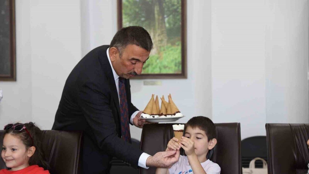 Zonguldak’ta "Valiyle tanışıp dondurma yemek istiyoruz" diyen çocuklar Zonguldak Valisi Osman Hacıbektaşoğlu ile bir araya geldi. Çocuklar tanışan Vali Hacıbektaşoğlu, miniklere elleriyle dondurma ikram etti.