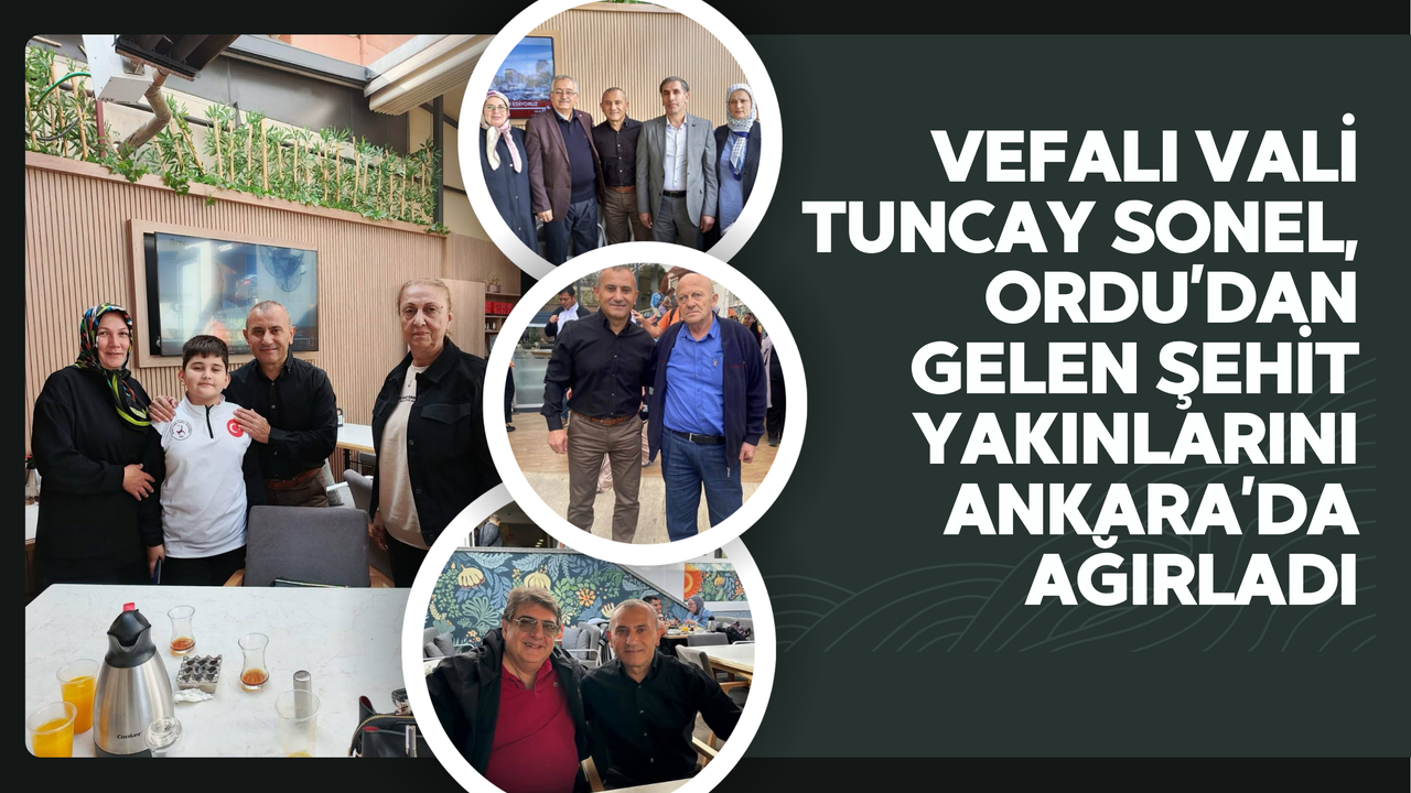 Vali-Mülkiye Başmüfettişi Tuncay Sonel, Ordu’dan gelen şehit yakınlarıyla Ankara’da anlamlı bir buluşmada bir araya geldi. Ordu Valiliği döneminde şehit aileleriyle kurduğu güçlü bağlarıyla tanınan Sonel, görev değişikliğine rağmen vefa duygusunu sürdürdü.