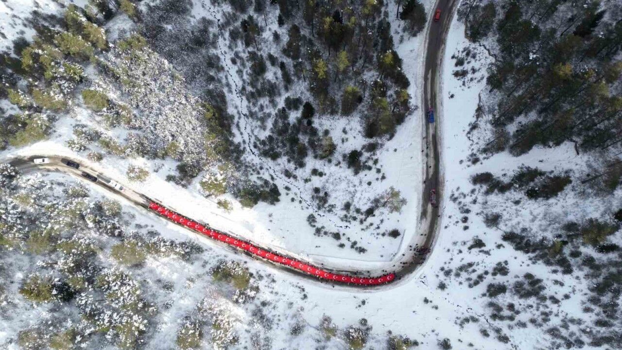 Gümüşhane’de Sarıkamış Harekâtı’nın 109. yıl dönümünde yüzlerce kişi şehitleri anmak için 100 metre uzunluğundaki Türk bayrağıyla eski Zigana Tüneli’nden başlayarak Zigana Kayak Tesisleri’ne kadar yürüdü.